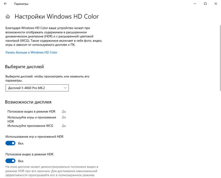 Чтобы получить HDR-сигнал с компьютера, нужно иметь графический ускоритель Nvidia уровнем не ниже GTX 1050. Диапазон HDR активируется в Параметрах экрана, достаточно выбрать нужный «дисплей» с именем нашей карты захвата.