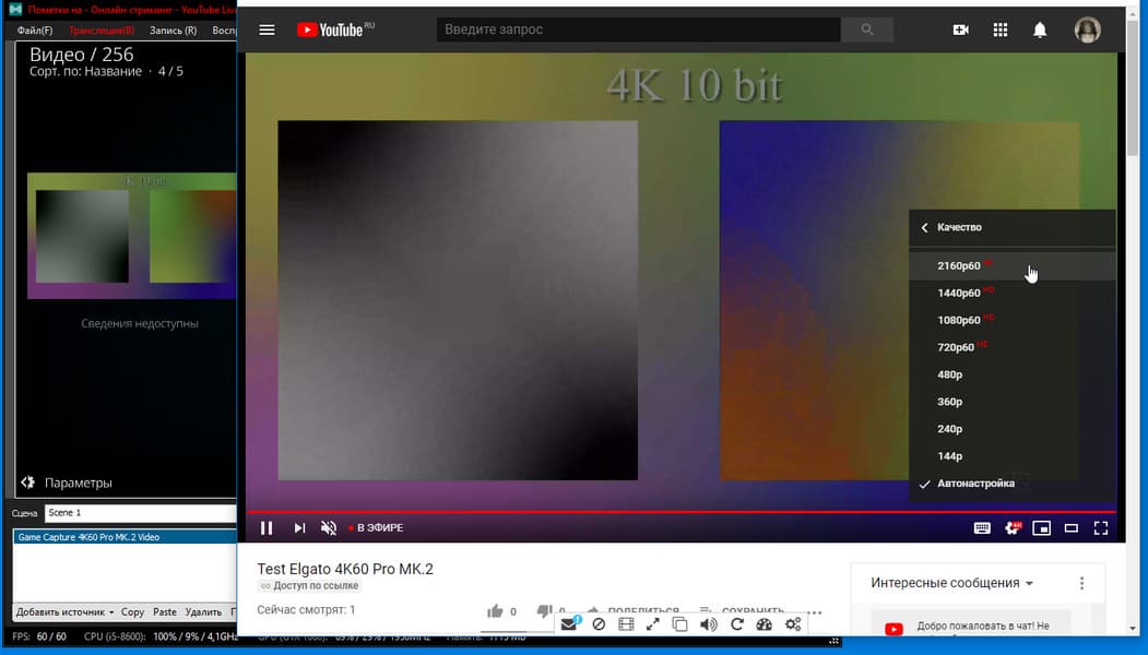 В момент запуска трансляции программа выводит всплывающее оповещение со ссылкой на YouTube, нажав которую, попадаешь на нужную страничку с транслируемым в данный момент материалом. Ниже приводится скриншот момента трансляции в формате 4K 60p (источником выступает медиаплеер, воспроизводящий тестовый видеофайл в формате 4K 60p HDR10).