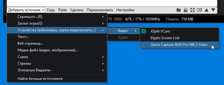 Теперь это приложение можно свернуть в панель задач и запустить XSplit (кстати, для работы Stream Link в XSplit и OBS нужно установить дополнение OBS NDI). В XSplit источники собраны в одном выпадающем меню, здесь нужно отыскать NDI с именем компьютера, в нашем случае это WORK (4K Capture Utility).
