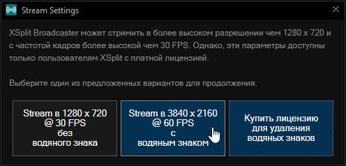 За возможность стримить в 4K разработчики просят долю малую в денежном выражении. Если их желание не удовлетворить, то транслируемое видео будет содержать водяной знак (watermark) с логотипом XSplit. Но мы не гордые, да и логотип симпатичный, пусть будет.
