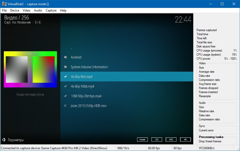 В связи со сказанным, тестирование карты захвата мы будем вести преимущественно по схеме №1, захватывая сигнал с внешнего источника. Этим источником выступит медиаплеер, видеовыход которого поддерживает нужное нам разрешение и частоту: 4K 60p. Конечно, захватывать и заново кодировать уже существующий видеоматериал — это звучит глупо. Но в техническом плане, в целях тестирования, происхождение видеосигнала не играет никакой роли. Да и, в любом случае, второго мощного компьютера у нас не имеется, как и современной (и любой другой) игровой приставки.