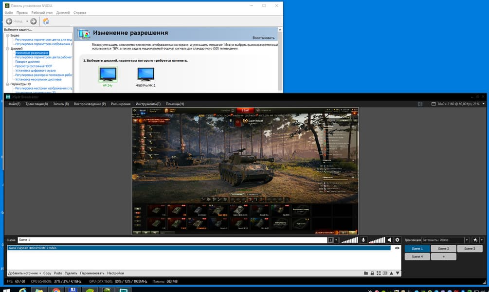 Подключать к компьютеру 4K-телевизор не хотелось, да и тем самым ресурсы графического ускорителя махом были бы съедены. Поэтому мы применили такой лайфхак: к одному из выходов видеокарты подключили Full HD-монитор, а второй выход соединили со входом карты захвата. То есть воспользовались второй схемой подключения, приводившейся ранее, но в одномониторном исполнении. Карта захвата превратилась для системы в обычный 4K-дисплей с именем 4K60 Pro MK.2. Просмотр потока, поступающего на карту захвата, возможен в любом приложении. В том же XSplit, например. Никаких проблем с разницей в разрешении не ожидается: размер изображения качественно даунскейлится с сохранением пропорций.