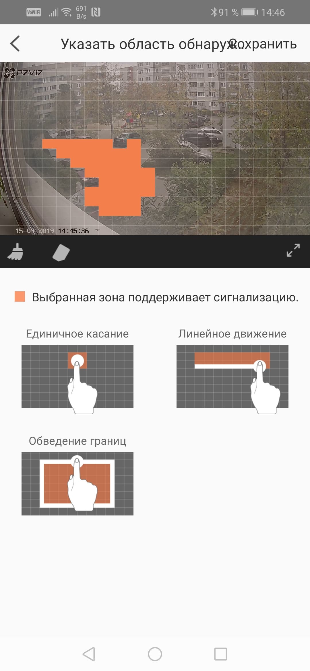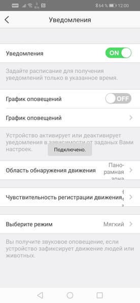Здесь же присутствуют пункты, переход по которым ведет к в отдельные страницы настроек. Например, пункт Уведомления раскрывает дополнительное меню, где настраивается общее поведение системы, пальцем рисуется зона детектирования движения, выбирается чувствительность детектора, активируются звуковые сигналы динамика камеры, сопровождающие событие.