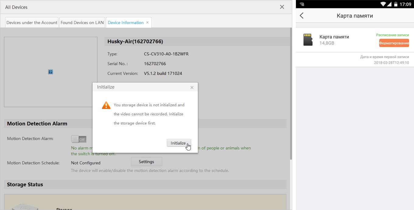 После недолгого обновления и перезагрузки, камера готова к работе. Однако полная функциональность аппарата доступна лишь в том случае, если в слоте камеры имеется карта памяти. Ее требуется подготовить для записи, делается это только вручную из мобильного приложения либо в программе для ПК.