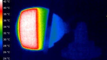 Исправная работа камеры гарантируется в температурном диапазоне от −30 до +60 °C при относительной влажности до 95%. На следующих теплоснимках показана рассматриваемая камера после многочасовой беспрерывной работы в комнатных условиях при температуре около +25 °C. Можно видеть, что риск перегрева камеры невелик: тепло, выделяемое электронной начинкой, эффективно распределяется по металлическому корпусу, играющему роль радиатора.