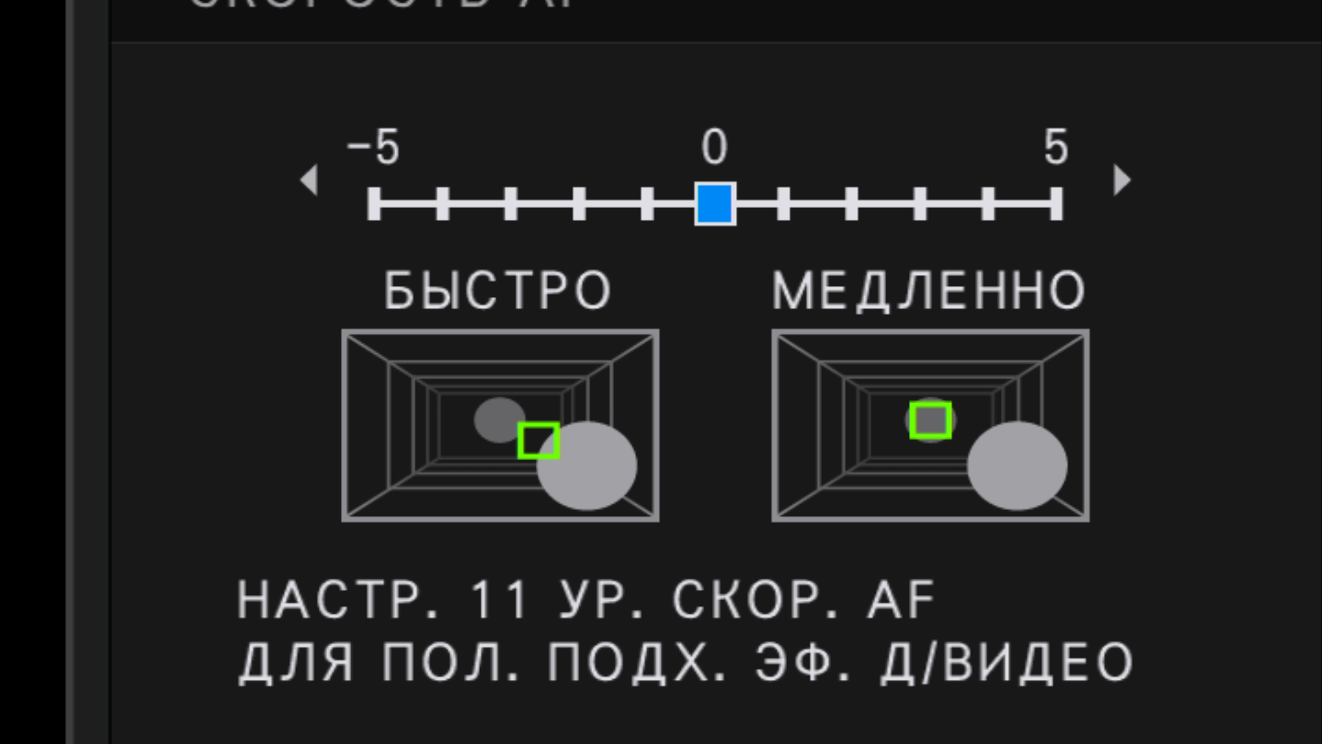 Это действительно важный параметр, серьезно влияющий на результат съемки. Настройки позволяют изменить эту скорость от −5 до +5, а получающаяся разница видна невооруженным глазом. Правда, «дыхание» непрерывного автофокуса изменением скорости не устранишь.