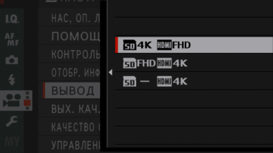 Но в случае с 4K-трансляцией все гораздо сложнее. Дело в том, что фотоаппарат не в состоянии вести 4K-запись на карту памяти и одновременно транслировать видео с таким размером кадра по HDMI. Нужный режим работы HDMI-выхода выбирается в настройках. Здесь доступны три режима работы HDMI-выхода, которые наглядно представлены с помощью пиктограмм: