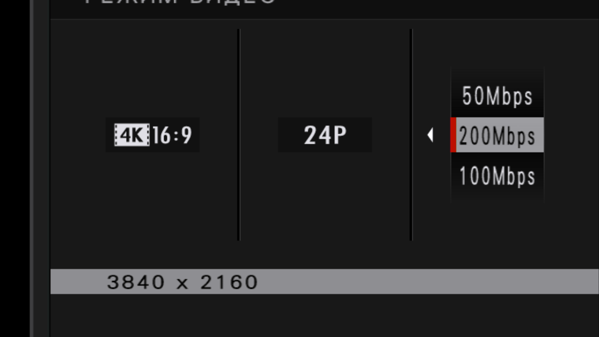 | 3840×2160 30p 50 Мбит/с | 3840×2160 30p 100 Мбит/с | 3840×2160 30p 200 Мбит/с |