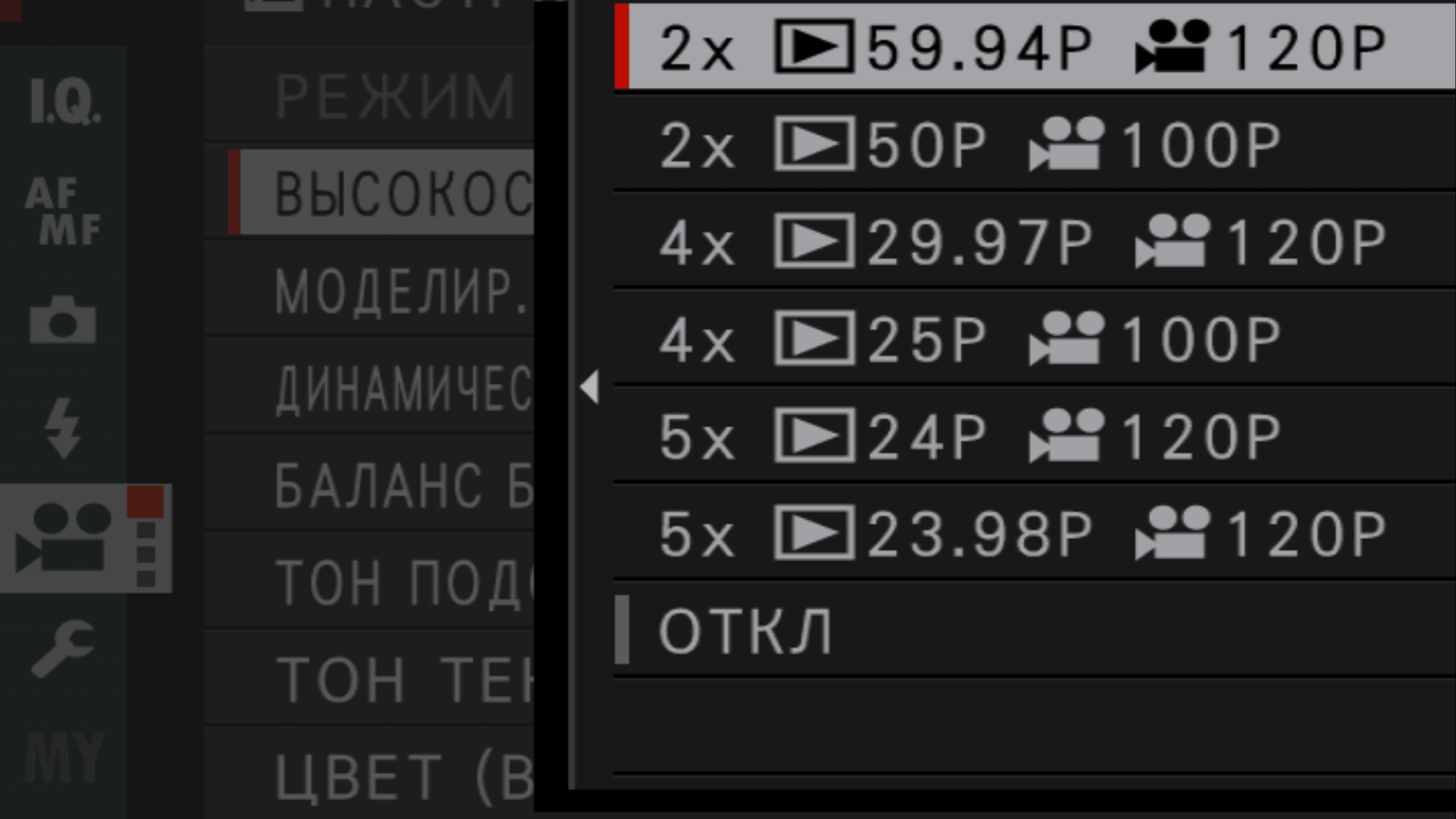 Отдельно от настроек главных видеорежимов вынесены параметры высокоскоростной съемки. Здесь все проще: в режиме скоростной записи камера производит съемку с частотой 100 либо 120 кадров в секунду, однако полученный поток может записываться в файлы с частотой 59,94, 50, 29,97, 25, 24 и 23,98 кадра в секунду. При воспроизведении таких файлов мы будем наблюдать замедление, соответствующее выбранной частоте кадров — от двукратного до пятикратного. Звука в таких файлах, разумеется, нет, а максимальный битрейт в скоростных режимах составляет 40 Мбит/с.