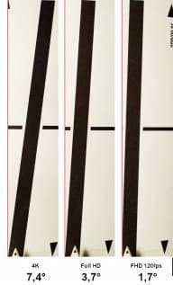 Изучим роллинг-шаттер (подробнее см. в материале Роллинг-шаттер в видеосъемке — описание дефекта, примеры, пояснения). Первое его проявление — это наклон вертикалей. Его несложно определить с помощью нашего специального стенда, в котором на вращающемся с постоянной скоростью (78 об/мин) цилиндре нанесена вертикальная метка. Измерение показало, что в рассматриваемой камере роллинг-шаттер дает максимальный наклон в 7,4° в режиме съемки 4K. При этом частота кадров в видео традиционно не влияет на наклон. В режиме Full HD наклон — а значит, и уровень роллинг-шаттера — снижается до 3,7°. Ровно вдвое, что с технической точки зрения совершенно правильно. Особняком стоит специальный режим записи — скоростная съемка. В таком режиме наклон падает до почти незаметных 1,7°.