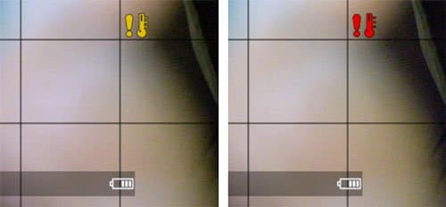 При длительной видеозаписи в максимальном 4K-режиме отдельные участки корпуса камеры нагреваются до 50 °C. Следующие теплоснимки были сделаны во время беспрерывной видеозаписи с секундными перерывами на остановку и включение, которая в течение 45 минут производилась в помещении при комнатной температуре около 25 °C.