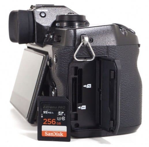 Два разъема для карт памяти расположены под откидной фиксируемой крышкой. Внутренняя сторона крышки имеет резиновую прокладку, которая обеспечивает пыле- и влагозащиту. Видеозапись может производиться на карту, вставленную в любой слот, но переключение между ними не производится автоматически по заполнении первой карты — выбор слота делается вручную в служебных настройках фотоаппарата.