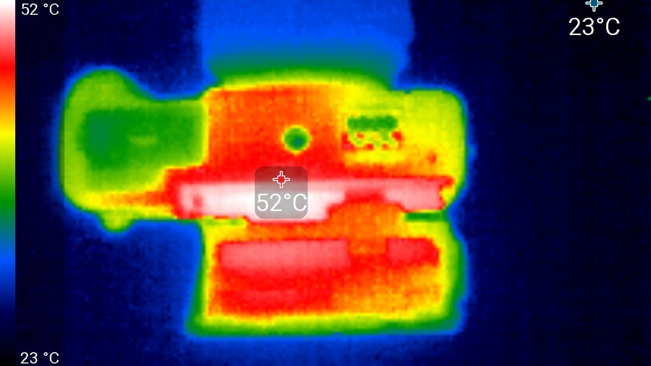 Наибольшая температура наблюдается на участке корпуса, который расположен под откидным экраном. Здесь корпус нагревается до 52 °C. Предыдущая модель камеры давала нагрев примерно в этой же области корпуса, но значительно меньший — 44 °C. Вот она, первая очевидная разница между моделями. Новый сенсор, новый процессор — они не только более производительные, но и более горячие. Впрочем, эти 52 °C — цифра неопасная, мы видывали гаджеты и погорячее.