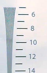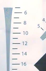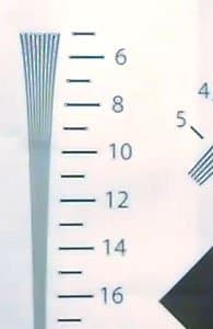 Взглянем теперь на разрешающую способность камеры в цифрах. Она измерялась путем съемки лишь одного ключевого участка тестовой таблицы, поскольку съемка таблицы целиком оказывается невозможной ввиду слишком широкого угла обзора камеры. В результате тестовых съемок были получены следующие результаты: