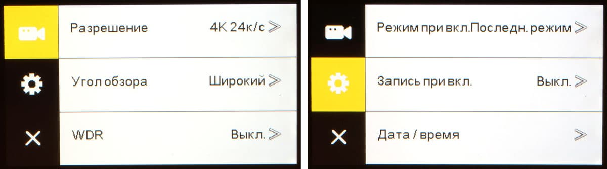 | 4K (2880×2160) 24p широкий угол | 4K средний угол | 4K узкий угол | 4K стабилизатор включен |