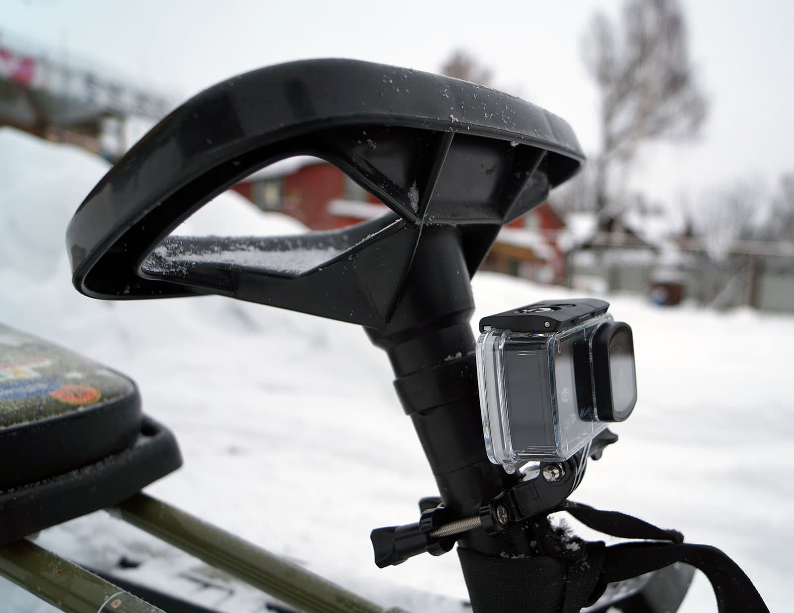 Набор креплений охватывает почти все возможные сценарии использования: на руле, шлеме, плоских поверхностях. Правда, относительно шлема и плоских поверхностей нужно сделать важную оговорку: не надейтесь, что липкая основа, обеспечивающая прочное сцепление площадок с гладкими поверхностями, будет надежна при минусовых температурах и даже при температурах, близких к нулю. Зимой такое крепление продержится минуту-две, а после первого же заметного рывка камера обязательно отвалится от места крепежа вместе с площадкой. Существует предположение, что клеевое соединение будет надежно держаться даже при минусовых температурах, но для этого монтаж необходимо производить при плюсовой температуре, то есть, соединяемые поверхности должны быть теплыми. И сухими, разумеется. А как это можно осуществить, если, к примеру, камеру требуется приклеить к капоту автомобиля или стеклу снегохода? Нет, все-таки самый надежный способ зимнего крепления — механический.