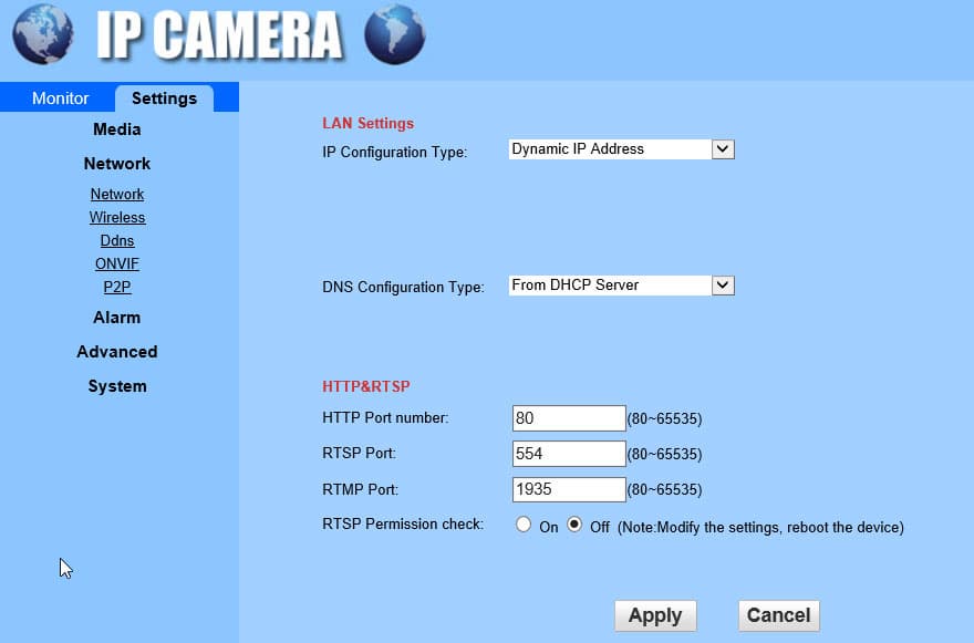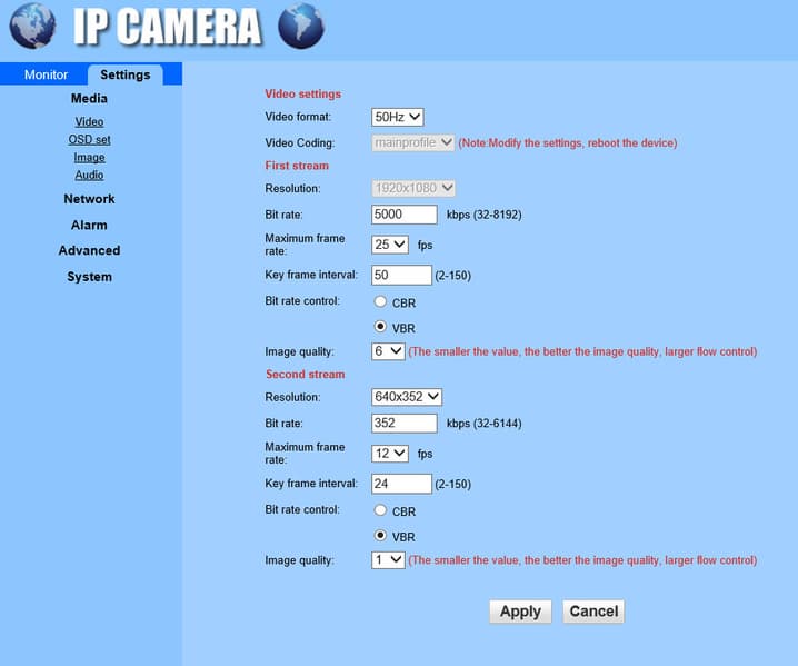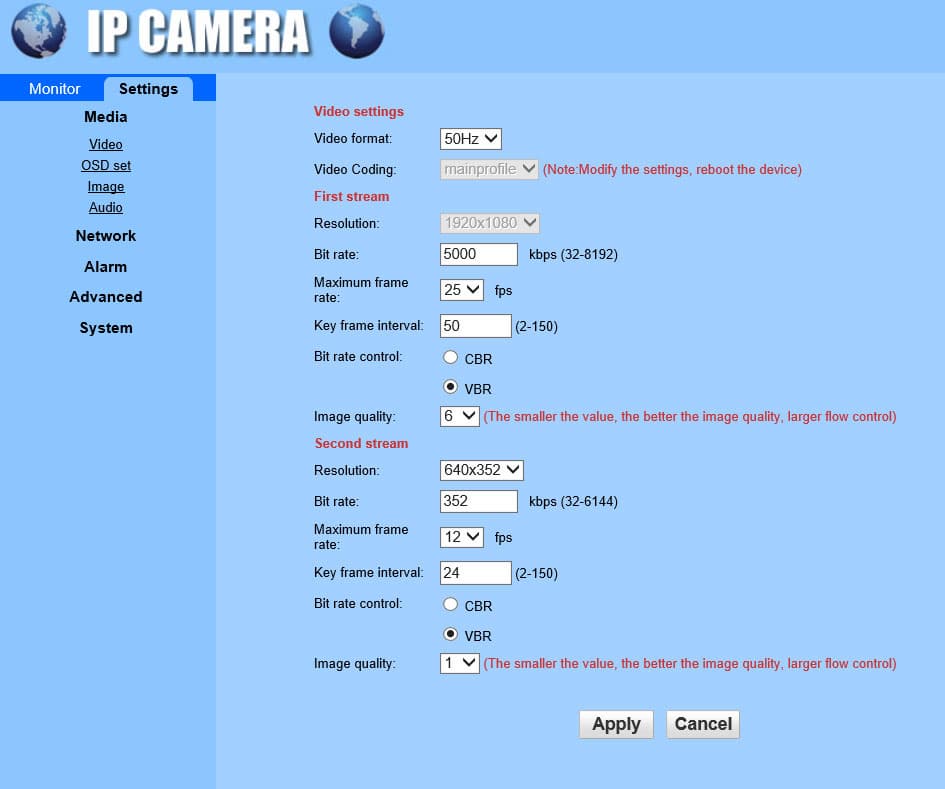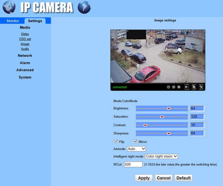 Но мы здесь находимся не для того, чтобы посмотреть в окошко или скачать те или иные файлы, а в целях получить полный спектр настроек аппарата. Они разбиты на пять тематических разделов: Media, Network, Alarm, Advanced и System. Рассмотрим наиболее важные параметры, те, которые полностью раскрывают скрытую в камере функциональность. Например, страничка с настройками обоих видеопотоков (основного и дополнительного) содержит инструменты, позволяющие изменить частоту электросети, битрейт видео, частоту кадров, а также выбрать способ кодирования: с постоянным уровнем битрейта или переменным. В видеонаблюдении лучше использовать переменный тип битрейта, это в разы экономит место в хранилище, а на качестве почти никак не сказывается. Характер картинки изменяется в пункте Image, здесь доступны стандартные для любой видеокамеры инструменты: яркость, контрастность, насыщенность, и резкость. Здесь же присутствуют переключатели, отражающие картинку по горизонтали или вертикали, а также инструменты, регулирующие работу инфракрасной подсветки.