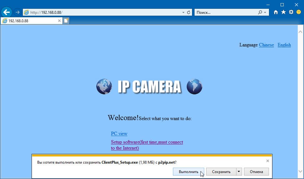 Второй способ подключения к камере открывает доступ к гораздо большему количеству настроек. Набрав в адресной строке браузера IP-адрес камеры в локальной сети, пользователь увидит стартовую страничку и предложение установить небольшую программу-клиент, без которой видеопоток с камеры будет недоступен. Ничего страшного в этом нет, устанавливаем.