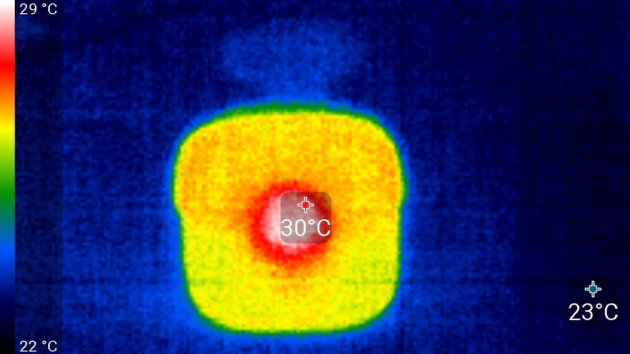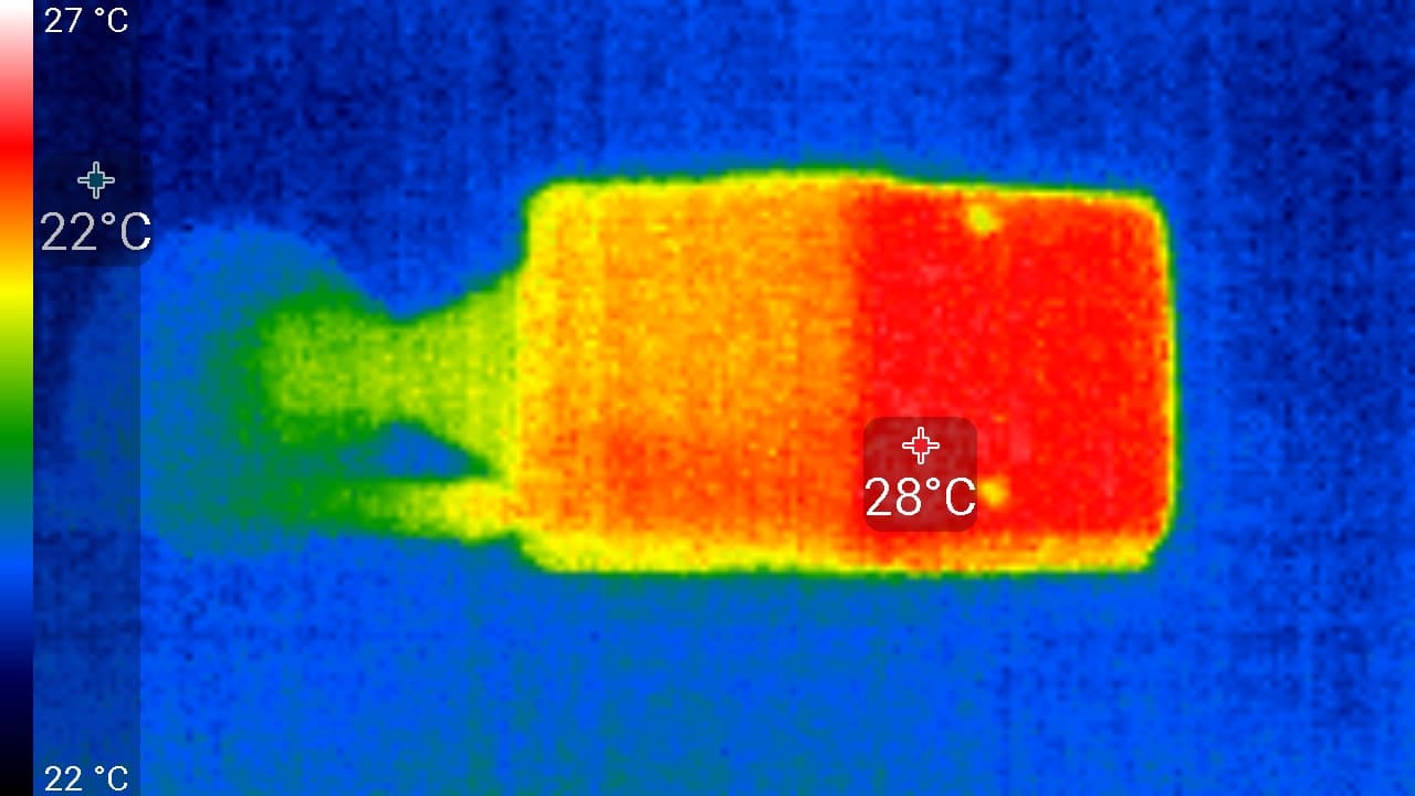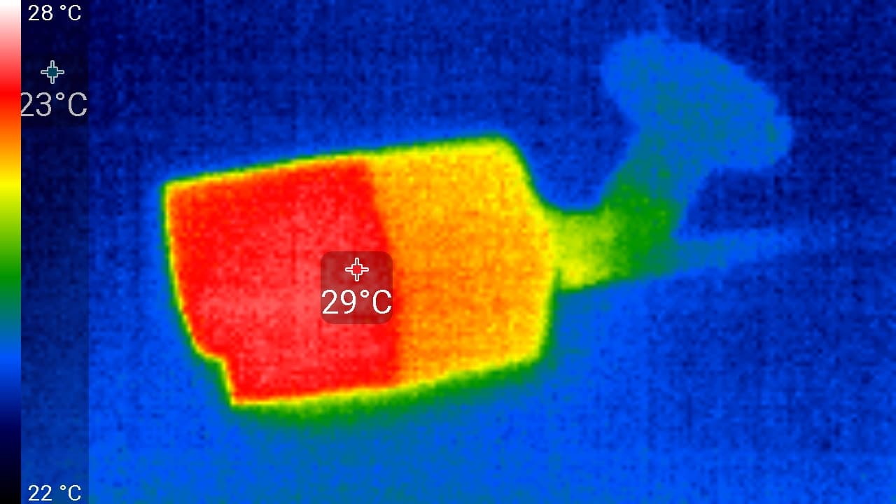 Температурный диапазон, в котором гарантируется бесперебойная работа камеры, довольно широк: от −30 до +60 °C. Но помимо температуры внешней среды, на работоспособность камеры влияет еще и тепло, вырабатываемое самой камерой, ее электронной начинкой. Насколько велик нагрев аппарата, нетрудно выяснить с помощью тепловизора. Следующие снимки сделаны в помещении с температурой 25 °C после нескольких часов работы камеры.
