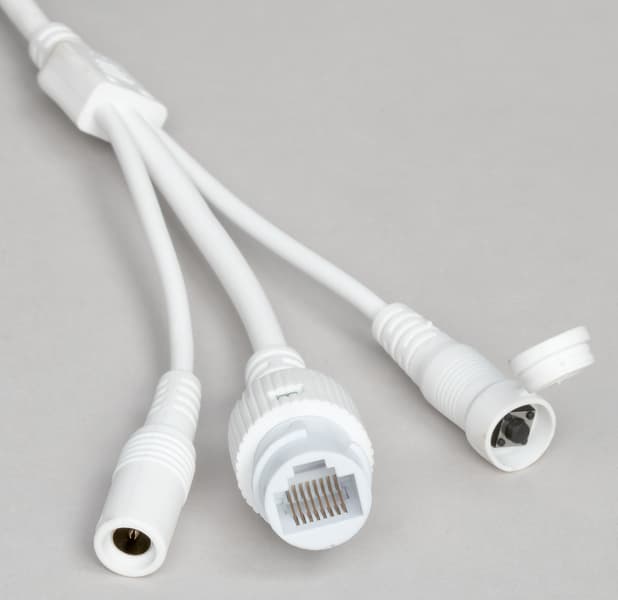 Все интерфейсы камеры (кроме слота карты памяти) вынесены наружу, длина интерфейсного кабеля составляет 35 см. Примечательно, что кнопка сброса (Reset) также вынесена наружу, она прикрыта резиновой заглушкой на гибкой ножке. Оригинальное, редкое решение. И довольно продуманное.