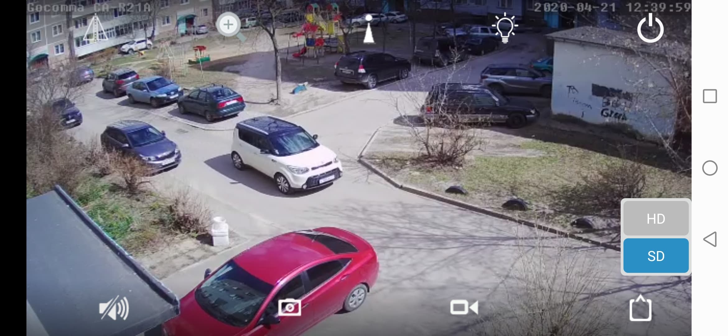Нажатие на строку с именем камеры приведет к отображению живого видеопотока, при этом картинка развернется во весь дисплей, а ориентация автоматически изменится на альбомную. Здесь из имеющихся инструментов будут полезен, пожалуй, лишь один: кнопка, изменяющая качество отображения с HD на SD и обратно. Прочие инструменты явно «заточены» под другие камеры с PTZ-функциями и неприменимы для нашей камеры, у которой нет ни моторов, ни зума, ни микрофона с динамиком.