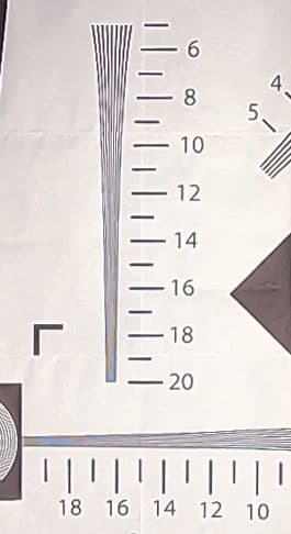 Съемки тестовой таблицы показывают ожидаемую зависимость разрешающей способности камеры от выбранного угла обзора. Чем меньше угол — тем ниже разрешающая способность, что естественно при обрезке кадра. В 5K-режиме с широким углом обзора камера дает более 2000 ТВ-линий по горизонтальной стороне кадра. 2000 — это максимум, который можно получить с помощью нашей таблицы. Да, пора заводить новую.