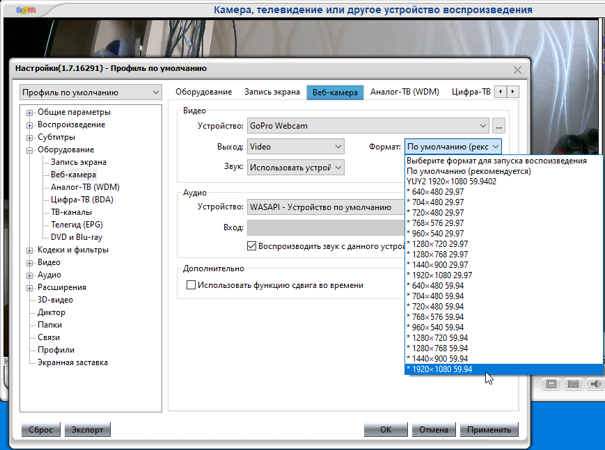 USB-порт теперь может использоваться для использования аппарата в роли веб-камеры. Для того чтобы компьютер распознал камеру, требуется установить фирменное программное обеспечение Windows GoPro Webcam. Теперь становится возможно получать видеосигнал непосредственно на ПК, но поддержку этой камеры имеют не все программы. например Viber отказывается распознавать камеру, в списке медиаустройств ее просто нет. Зато PotPlayer прекрасно отображает как камеру, так и ее видеосигнал. Причем с разрешением Full HD.