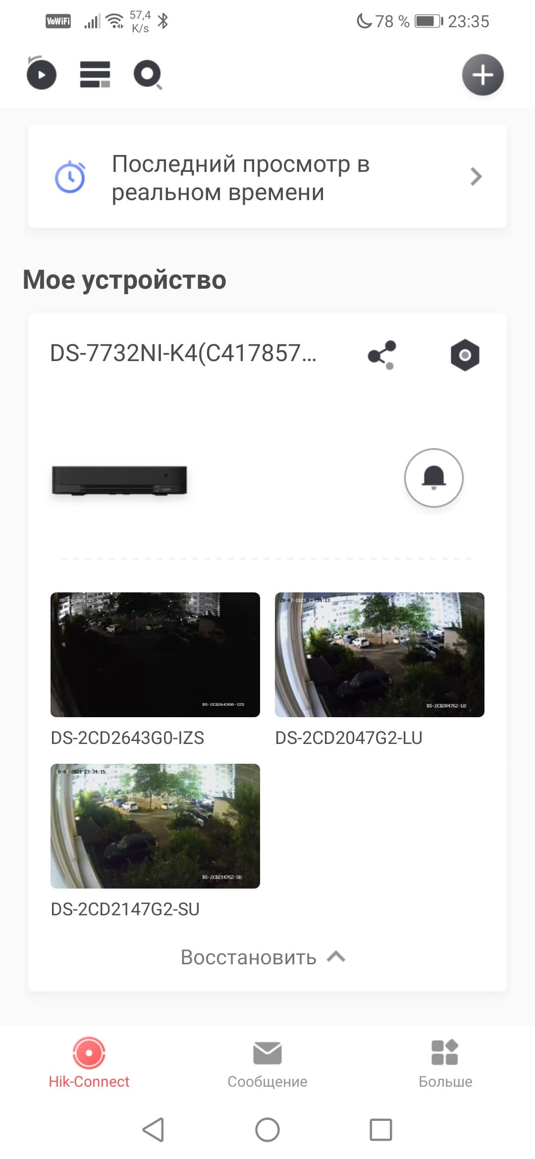 Однако и тут мы получили функциональностью наотмашь. Это большая и приятная неожиданность. Настройки, которые доступны в мобильном приложении Hik-Connect, немногим уступают браузерным. Конечно, они упрощены и направлены на мобильность, но ведь приложение-то мобильное. Несмотря на это, здесь присутствует даже модуль просмотра архива с возможностью поиска событий.
