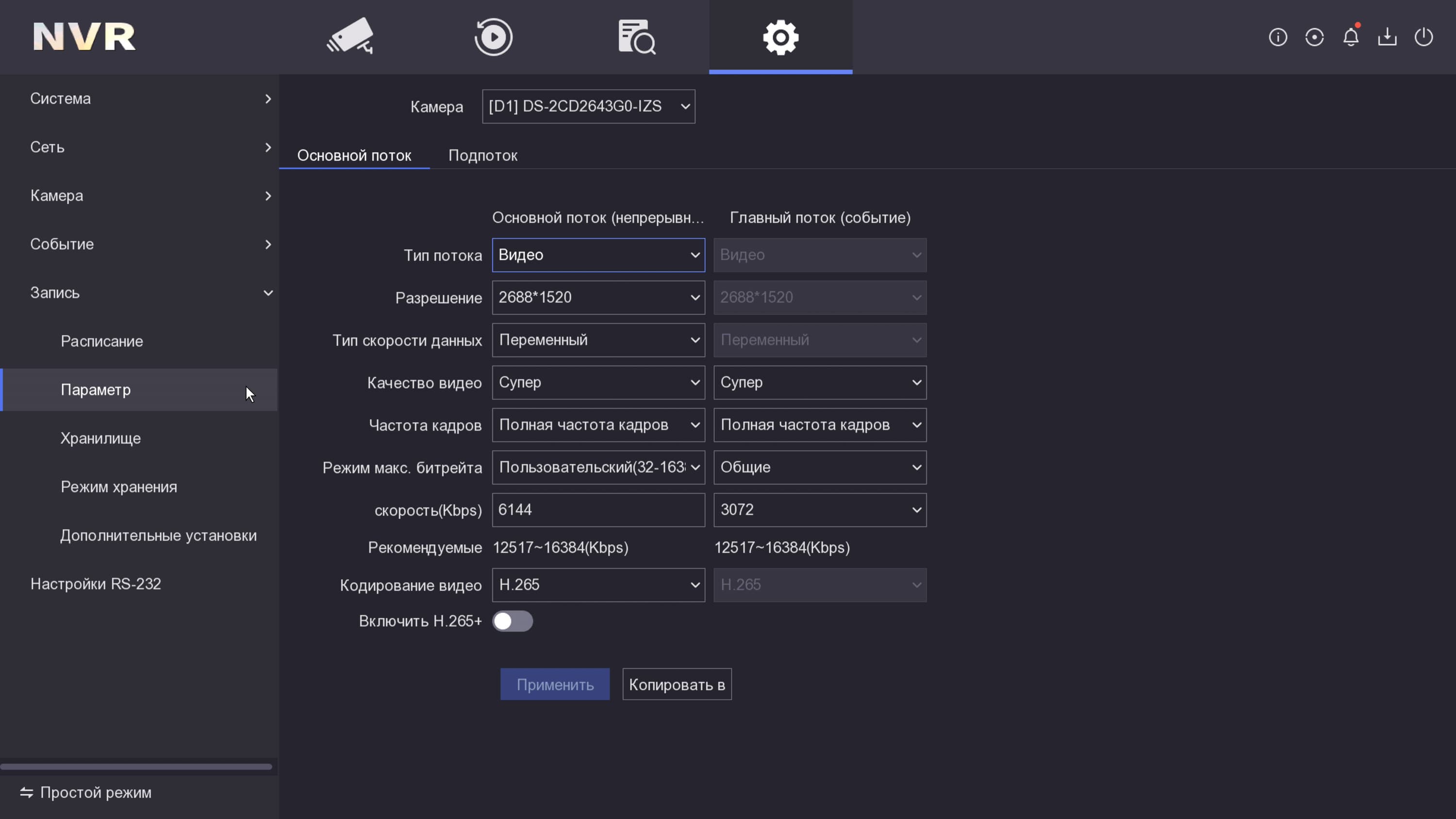 Максимальный размер, с которым рассматриваемые камеры могут записывать видео, составляет 2688×1520 пикселей при частоте 25 кадров в секунду. В настройках камер имеется возможность настроить качество сжатия и регулировать битрейт. Максимальный уровень битрейта для потока 2688×1520 составляет 8192 Кбит/с. При переключении в алгоритм + в настройках кодирования появляется дополнительная строка, Максимальный средний битрейт. Именно на этот битрейт ориентируется камера при кодировании статики, отсюда получается почти двукратная экономия. Кстати, после переключения алгоритма сжатия с обычного на + камере требуется перезагрузка.