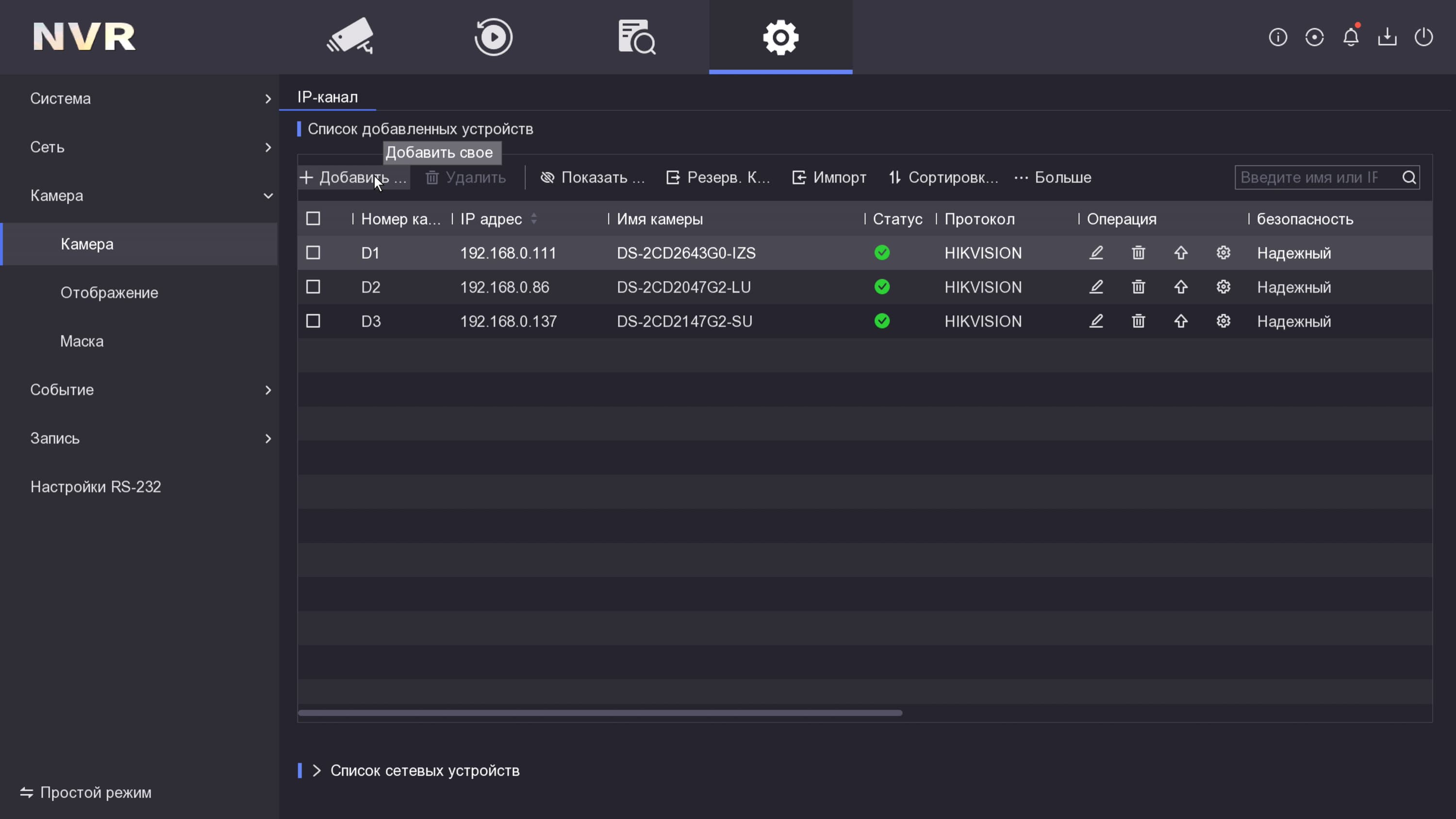 Здесь доступны те же самые настройки, которые предоставляет регистратор через свой видео-интерфейс: системные, сетевые и т. д., включая возможность подключения и настройки камер.