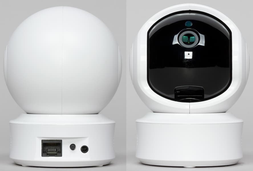 «Старшая» модель получила корпус, состоящий из трех частей — массивного основания, поворотной секции (обеспечивает вращение в горизонтальной плоскости) и находящегося внутри нее шарообразного блока с камерой (отвечает за вертикальное перемещение). По бокам основания видны отверстия встроенных динамиков.