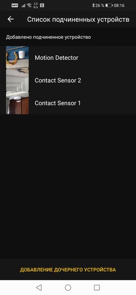 Эти датчики не нуждаются в Wi-Fi, они связываются с камерой в своем диапазоне, который не дает высоких скоростей передачи данных (большие объемы тут и не нужны), зато менее чувствителен к препятствиям. Подключение каждого устройства производится нажатием строки Добавление дочернего устройства, одновременно следует нажать и удерживать кнопки на датчиках. Ошибки исключены, мы несколько раз подключали и удаляли датчики, всякий раз на операцию подключения уходило не более 10 секунд. Здесь важно, чтобы датчик и хаб (камера) располагались недалеко друг от друга. Каждый из трех подключенных датчиков можно переименовать и разместить его в любом помещении, которые создаются в приложении заранее.