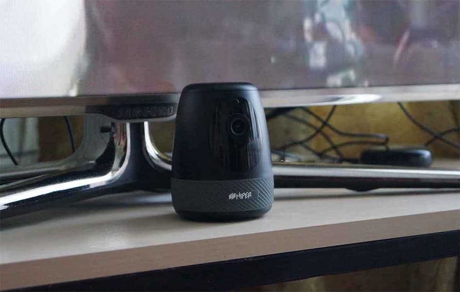 Высота неподвижного основания едва достигает 8 мм, а зазор между основанием и поворотным корпусом практически незаметен. Лицевая сторона корпуса содержит оптико-электронный блок с объективом, датчиком освещенности и скрытыми за темным пластиком инфракрасными светодиодами, работающими в темноте. На задней стороне находится решетка встроенного динамика.