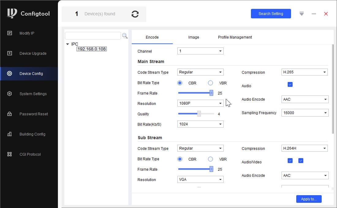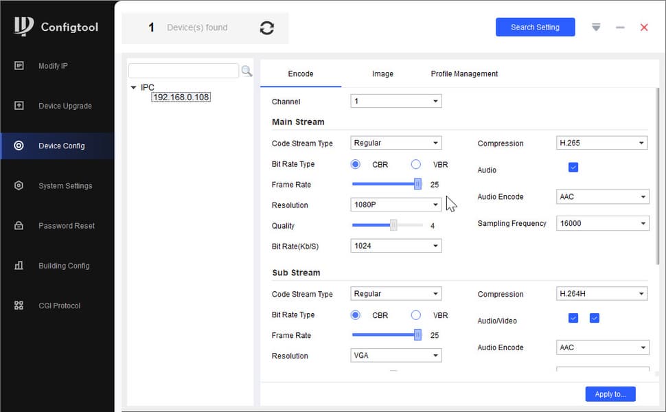 Максимальный размер, с которым камера может записывать видео, составляет 1920×1080 при частоте 25 кадров в секунду. В настройках камеры отсутствует возможность регулировать битрейт или качество, по умолчанию для Full HD-потока битрейт составляет 1 Мбит/с. Несмотря на низкое для стандарта значение, фактически в статичном наблюдении нет нужды использовать большие битрейты. И тем более, когда используется современный кодек HEVC.