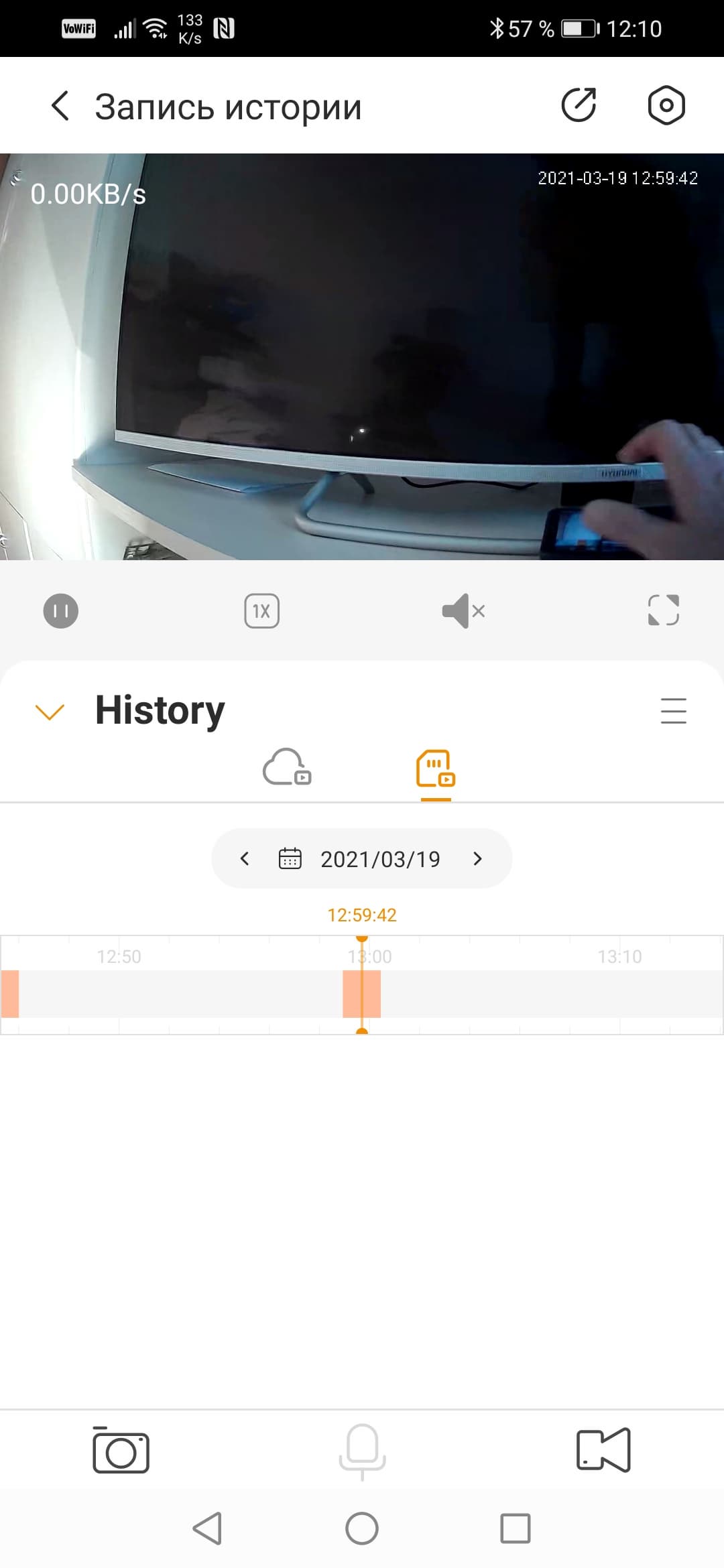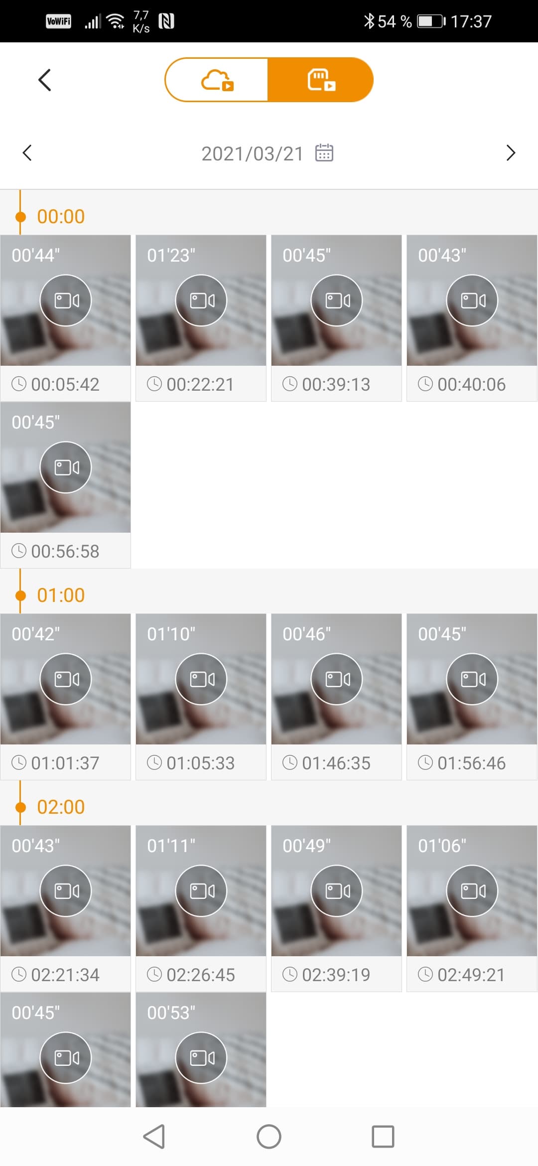 Просмотр архива, хранящегося на карте памяти или в облаке, производится в отдельном модуле. Каждая видеозапись, сделанная камерой по тревоге, отображается в виде иконки. Которая, к сожалению, не содержит миниатюру из видеопотока. Просмотр в таком режиме возможен только после скачивания выбранного ролика в память смартфона. Есть и второй способ просмотра архива — таймлиния, где каждая тревожная запись отмечена цветовым маркером. Очень удобная штуковина.