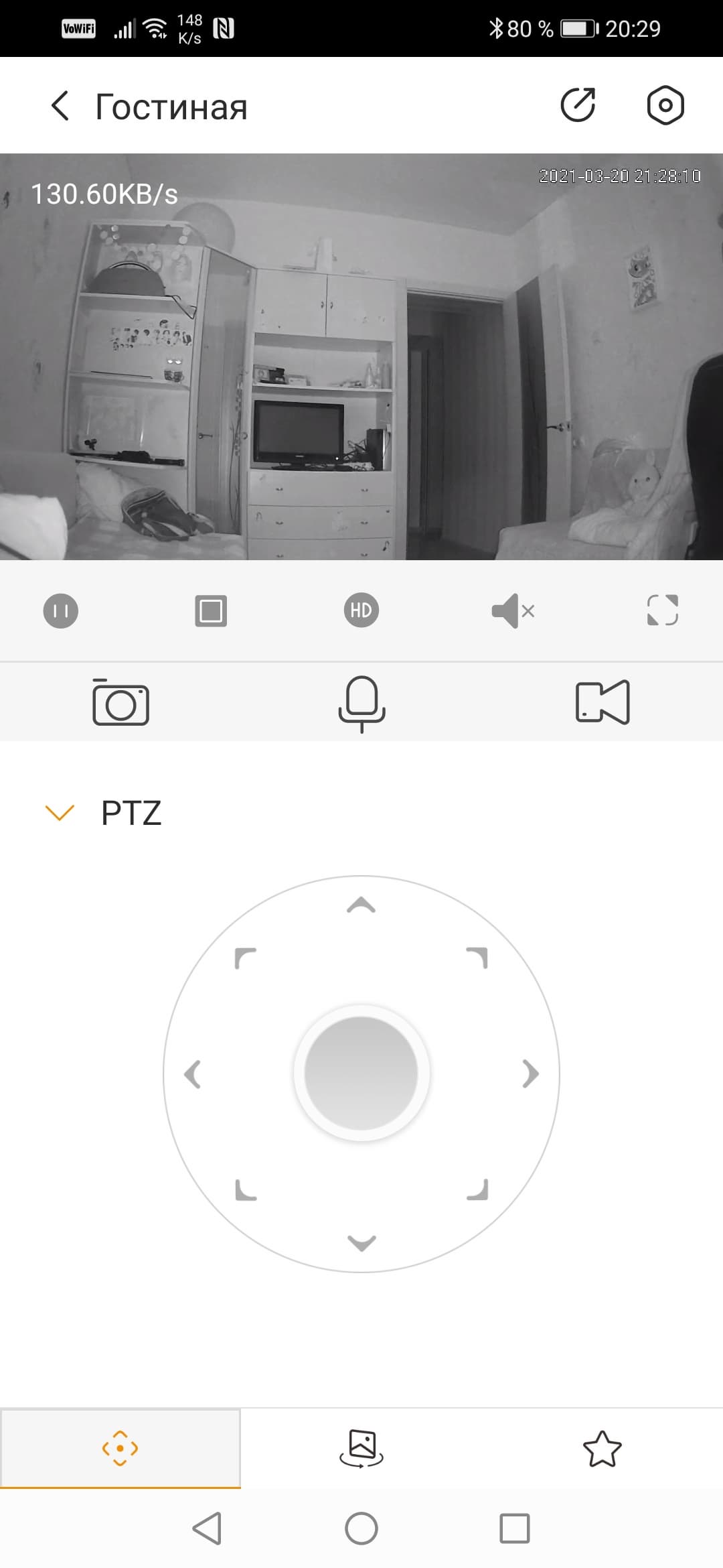 В этой главе хотелось бы отметить два момента. Первый касается управления PTZ-механизмом. Поворот и наклон осуществляется касанием к стрелкам виртуального джойстика, однако нажатие и удержание стрелок не приводит к долгому движению камеры, шаровый блок реагирует на нажатия короткими поворотами и наклонами, дискретными. Для того, чтобы быстро повернуть или наклонить объектив на любой угол, требуется перетащить в нужную сторону и удерживать центральную кнопку джойстика.