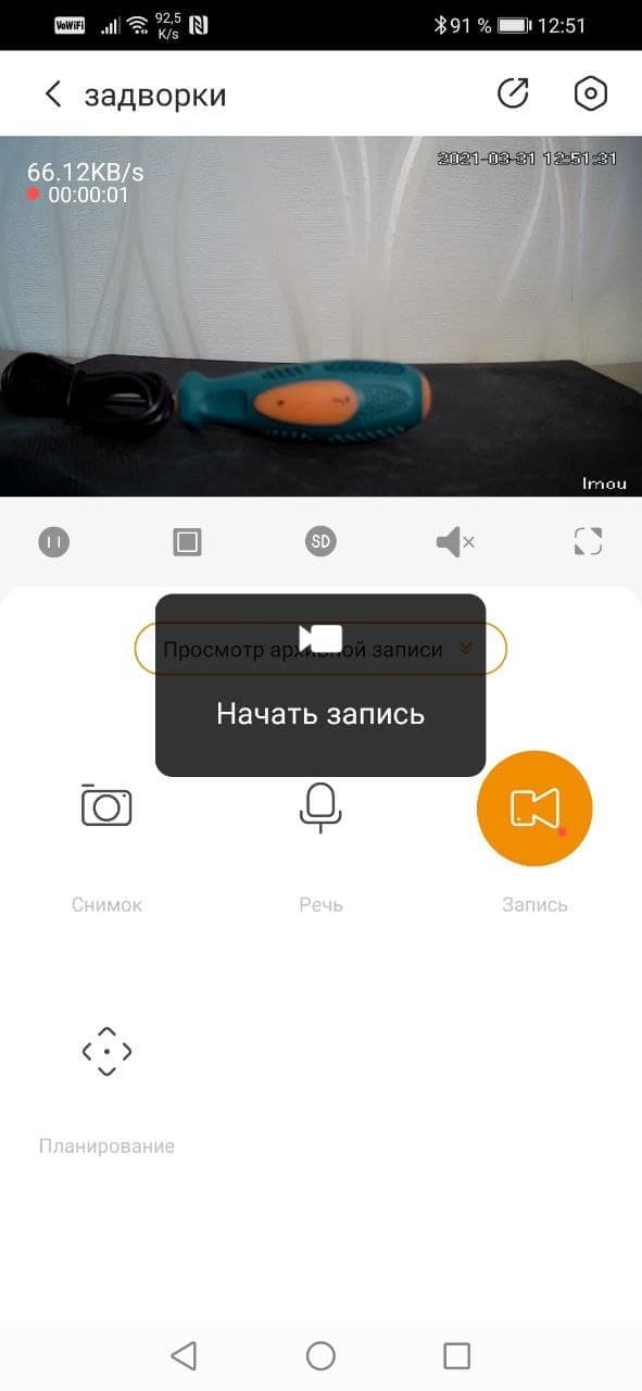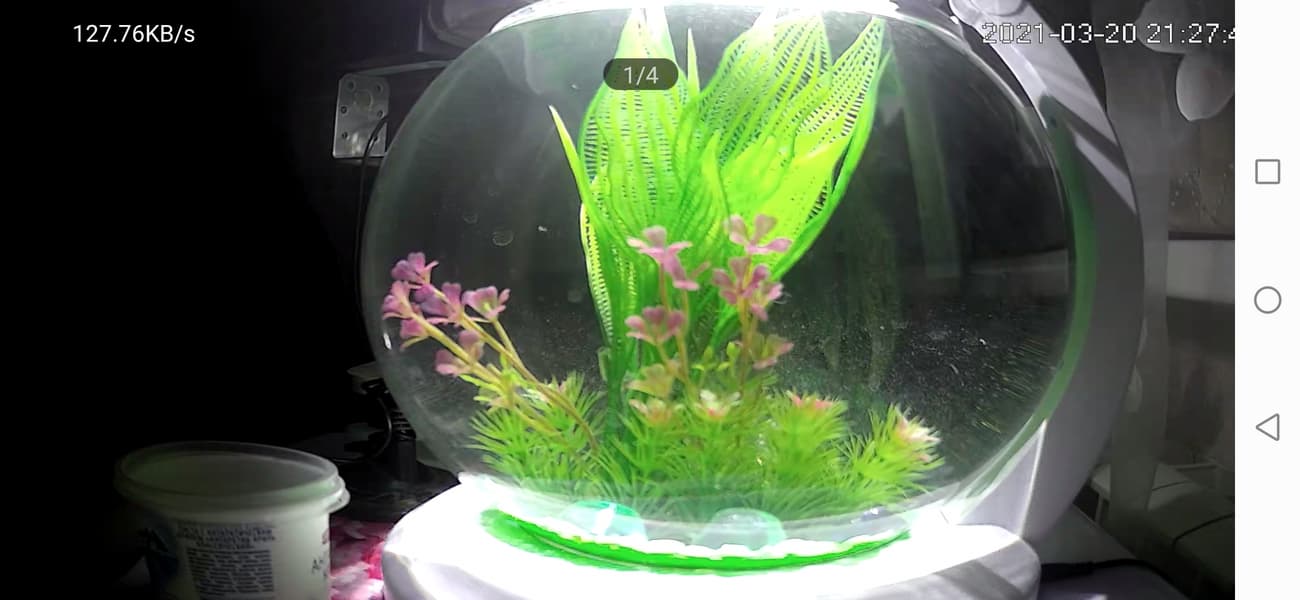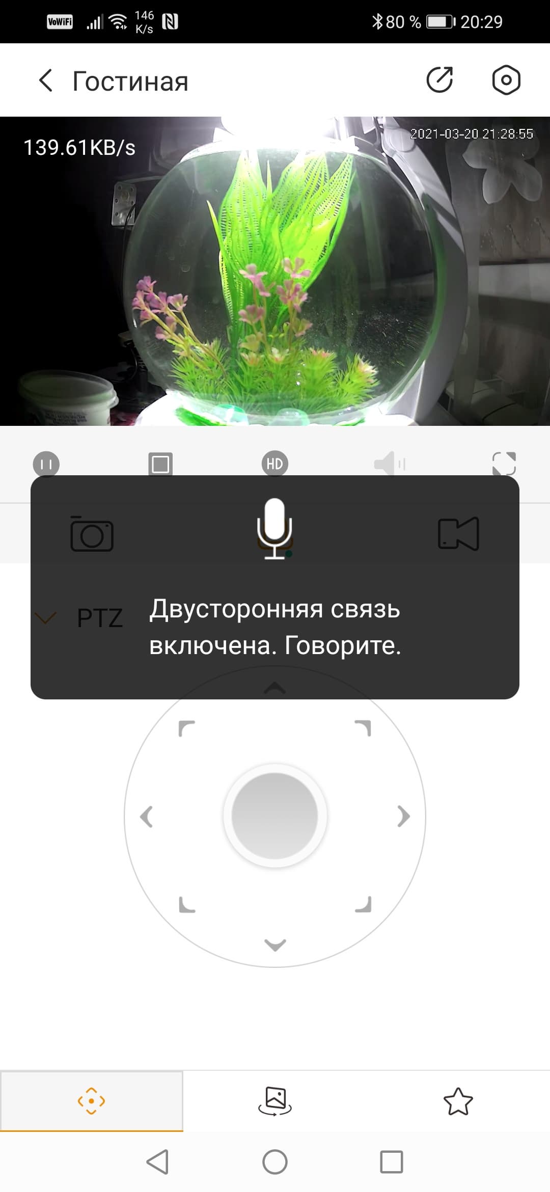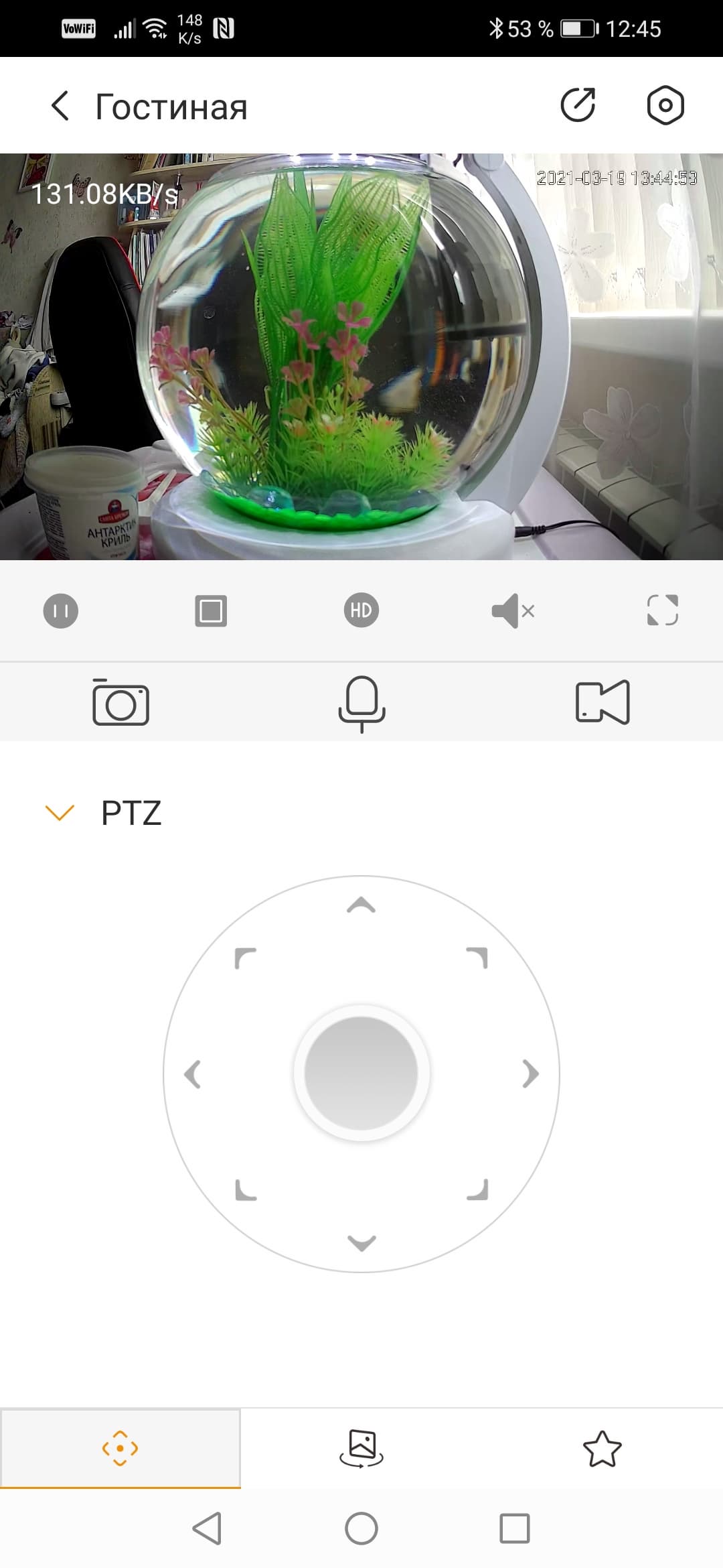Но и похвалить разработчиков есть за что. Приложение работает устойчиво, зависаний и вылетов не наблюдается. Отметим очень быструю инициализацию видеопотока. Это показано в следующем ролике, где камера наблюдает за аквариумом, рядом с которым установлена автоматическая кормушка. Чтобы дать рыбке порцию корма, необходимо задействовать фирменное приложение. Но ведь хочется еще и воочию убедиться, что кормушка сработала. Тут-то и поможет быстродействие приложения Imou: программа, даже будучи вызванной из фонового режима, почти мгновенно начинает отображать живое видео, и мы успеваем увидеть, как вертится корпус кормушки, одаривая Пирата (это имя рыбки) ежедневным пайком.