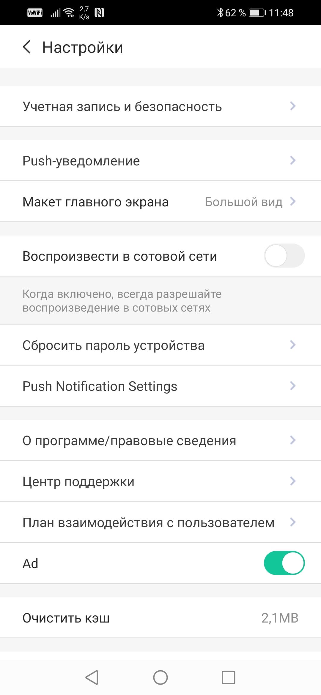 Настройки приложения позволяют внести изменения в учетную запись, включить/выключить Push-уведомления о событиях и разрешить воспроизведение видео при нахождении в сотовой сети.