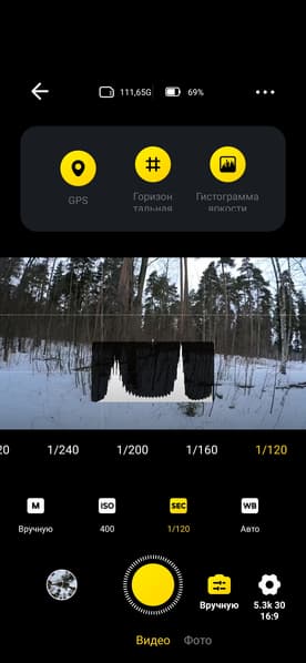 Еще интереснее: если камера связана со смартфоном, то ее механическая кнопка записи не действует. Да и вообще ничего не действует, даже сенсорный дисплей. А вот так: если вы решили управлять камерой со смартфона, то уж будьте добреньки, начинайте и заканчивайте запись только смартфоном, никак иначе. Вдвойне мудрое решение. Мы эту мудрость глубоко прочувствовали, когда в мороз катались с камерой на велосипеде. Удобно же: соединил камеру со смартфоном, выбрал нужный формат записи, включил запись, заблокировал смартфон, убрал его в карман, надел перчатки — можно ехать. Поездка закончена? ОК, доставай смартфон, разблокируй, устанавливай потерянную связь с камерой, щёлкай по кнопке REC для остановки записи. На самом деле, конечно, мы во время поездки смартфон не блокировали, установив в нем получасовой интервал до автоблокировки. Но так делать нельзя: всегда существует риск произвольных нажатий на дисплей смартфона, мало ли что в кармане болтается.