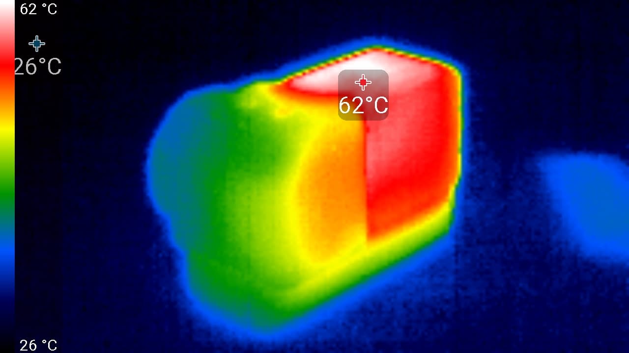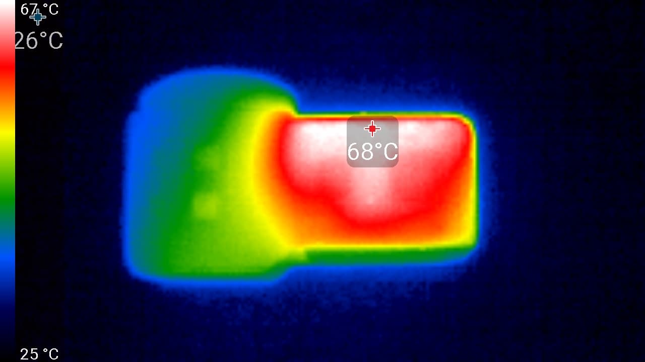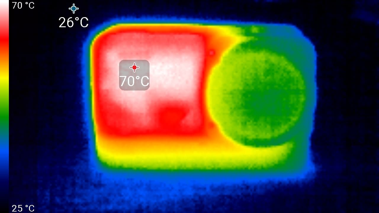 Во время длительной записи аппарат сильно нагревается. Очень сильно. Мы такого нагрева не наблюдали ни у одной из исследованных камер. Эти тепловизионные снимки сделаны в процессе длительной автономной записи, тестирование проводилось в помещении с температурой около 26 °C.