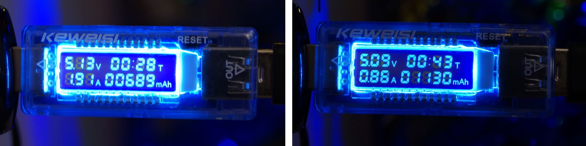 Прилагаемая аккумуляторная батарея имеет емкость 1190 мА·ч, ее зарядка длится менее часа при использовании пятивольтового двухамперного зарядного устройства. В начале процесса зарядки аккумулятор потребляет в среднем 1,7 А, иногда «разгоняясь» до 1,9 А. Это означает, что использовать адаптер мощностью выше 2 А не имеет смысла, камера все равно не возьмет больше положенного.