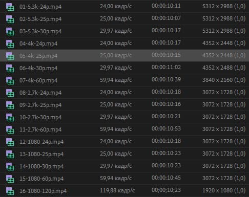Почему мы начали со скриншотов какой-то программы? Обратите внимание на столбцы с размерами кадров, они с краю, справа. На первом скриншоте размеры некоторых файлов выглядят несуразными, дикими цифрами. Никак не соответствующими формату. Именно такие цифры дают абсолютно все программы-анализаторы, видеоплееры и видеоредакторы (кроме Adobe Premiere Pro с установленным фирменным плагином). Но во втором скриншоте размеры кадров в норме. Это потому, что второй скриншот сделан после установки фирменного ПО и, соответственно, плагина для Premiere Pro.