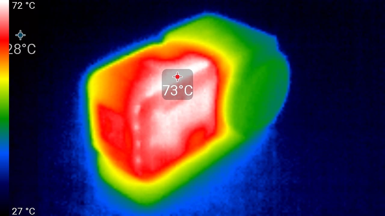 Видно, что максимальная температура некоторых участков корпуса основного блока (который главный, с экраном) составила аж 73 °C. Но что характерно: Insta360 One R не отключается! Даже такой сильный нагрев не является для нее серьезным поводом для аварийного завершения работы.