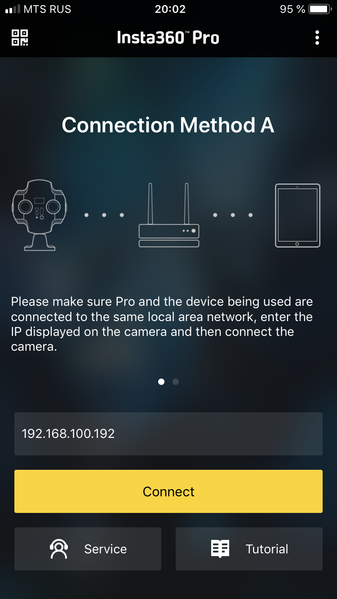 Процесс сопряжения камеры, передатчика и приемника несложен, хотя и может занять минуту-две. Включив камеру с подключенным к ней передатчиком, следует дождаться получения камерой IP-адреса, который высветится на ее дисплее. Теперь нужно включить приемник, а на подключенном к нему смартфоне запустить приложение Insta360 Pro, выбрать метод связи A (Connection Method A) и вписать IP-адрес в соответствующее поле. Если последовательность действий не нарушена, то соединение обязательно состоится.