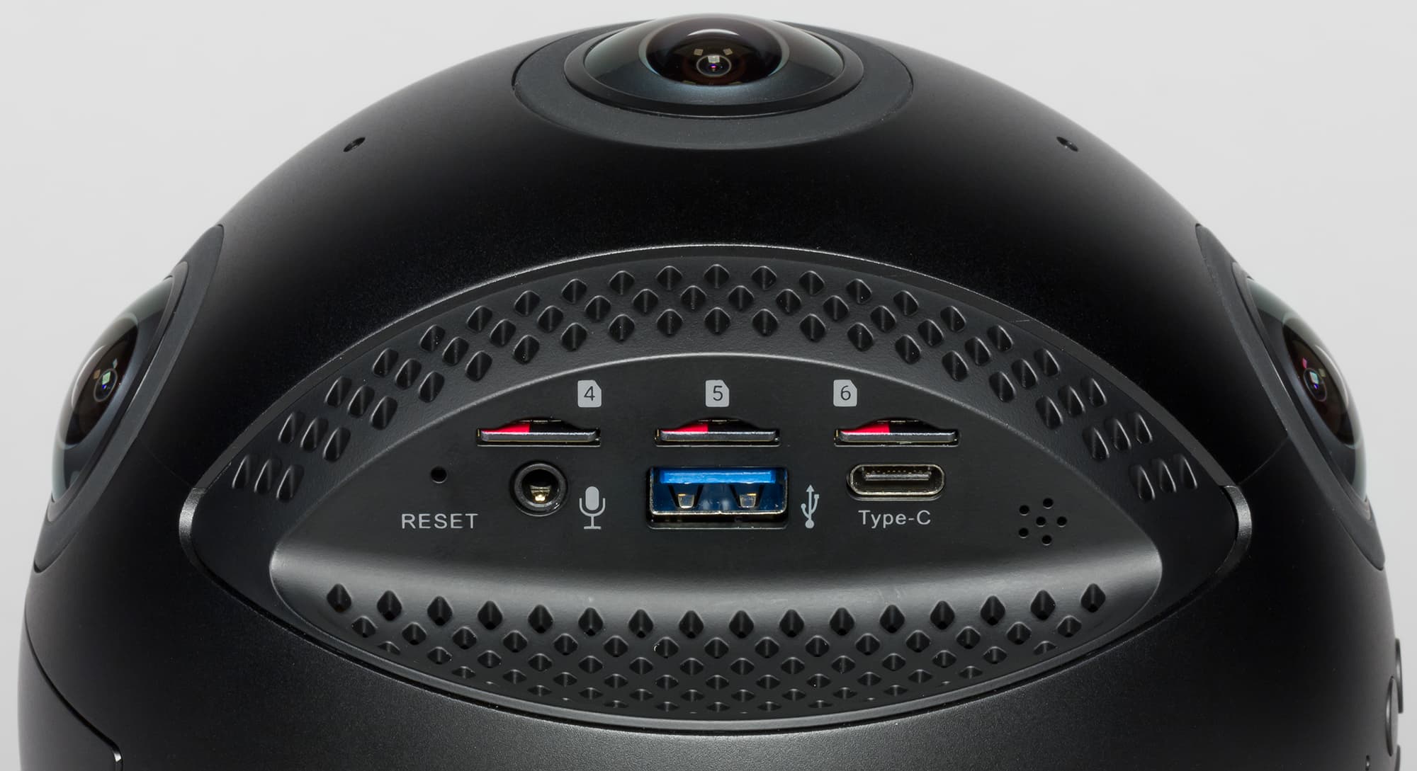 В верхней части корпуса, на «северном полюсе», появилось резьбовое отверстие стандартного диаметра 1/4″. Оно предназначено для крепления передатчика Insta360 FarSight и/или микрофонной системы. Одна из верхних боковых граней обогатилась портом USB 2.0, который нужен для подключения внешнего аудиорекордера либо питания внешних устройств (например, FarSight). Противоположная верхняя грань также имеет дополнительный микрофонный вход 3,5 мм.