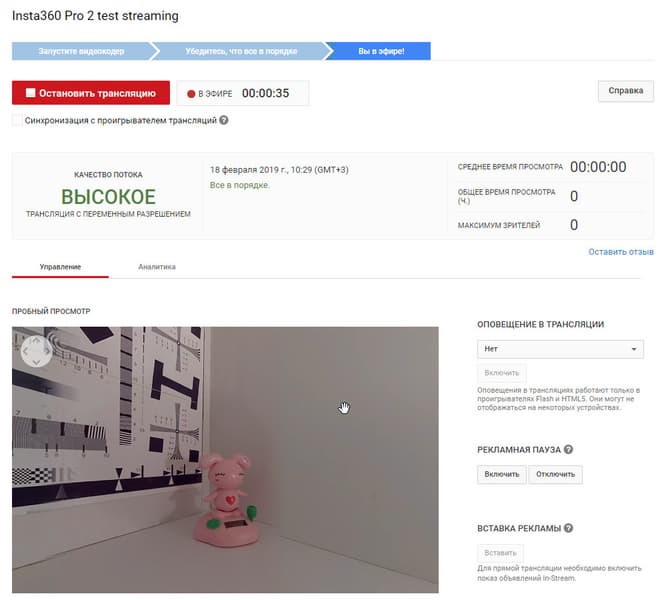 Все готово к трансляции, достаточно нажать кнопку Live, и стриминг будет запущен.