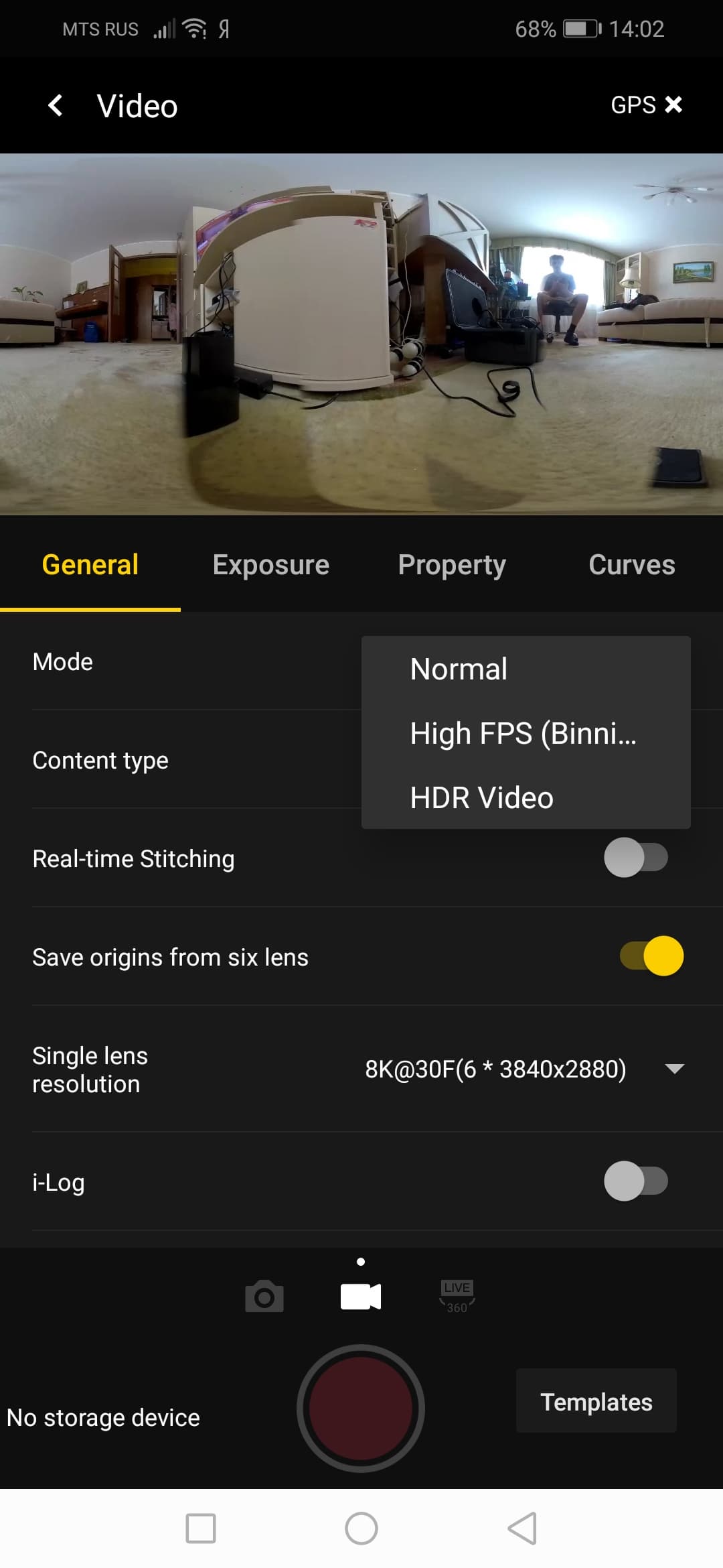 Помимо обычной «плоской» панорамы, Insta360 Pro 2 позволяет создавать 3D-панорамы. Частота видео в таких файлах вдвое ниже (30p), но размер кадра остается неизменно высоким, 7680×7680 (при просмотре 7680×3840). Впрочем, можно чуть пожертвовать разрешением, снизив его до 6K, зато частота кадров увеличится до 60p.