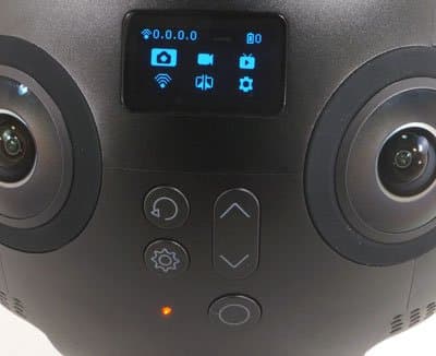 «Передняя» или «задняя» части в камере отсутствуют, как отсутствуют в невесомости понятия «верх» или «низ». Для удобства передней частью камеры мы посчитали ту, где находится миниатюрный матричный дисплей и механические кнопки управления камерой. Шесть объективов, расположенные по экватору сферы, обеспечивают полный обзор во всех направлениях. Между объективами виднеются мелкие объекты — это встроенные микрофоны, а заодно и трехцветные светодиоды, утопленные в корпус и сигнализирующие о текущем состоянии камеры: например, мигание белым цветом означает нормальный ход видеозаписи, а постоянное свечение красным цветом предупреждает о скором разряде батареи.