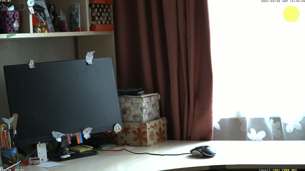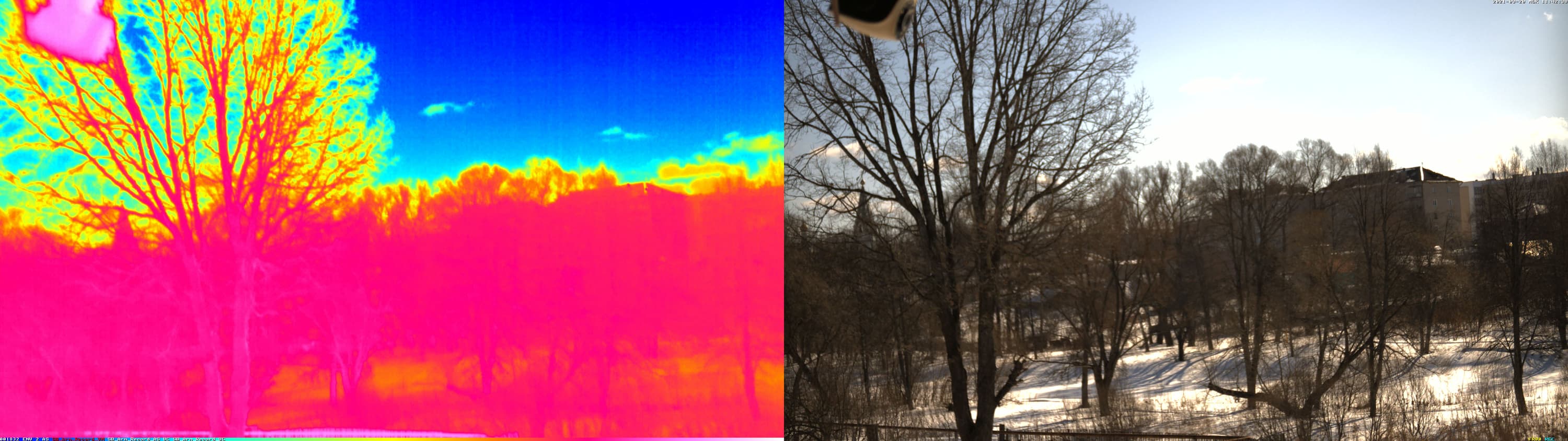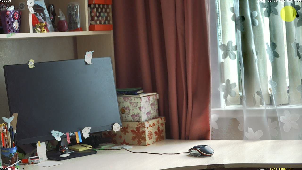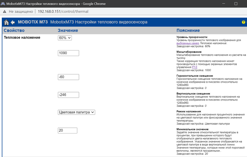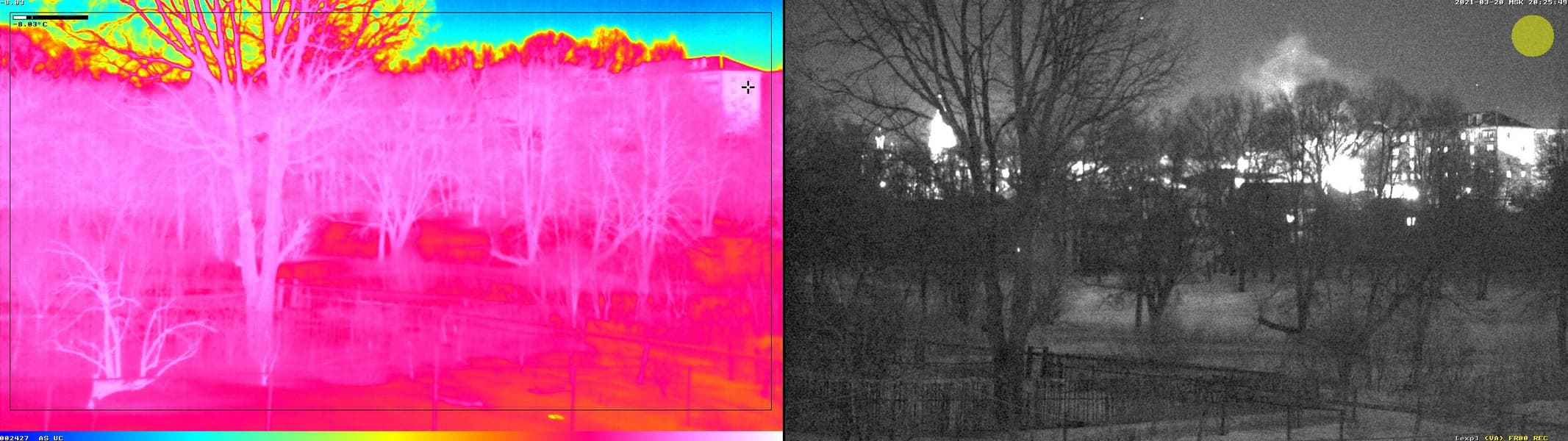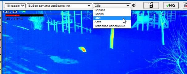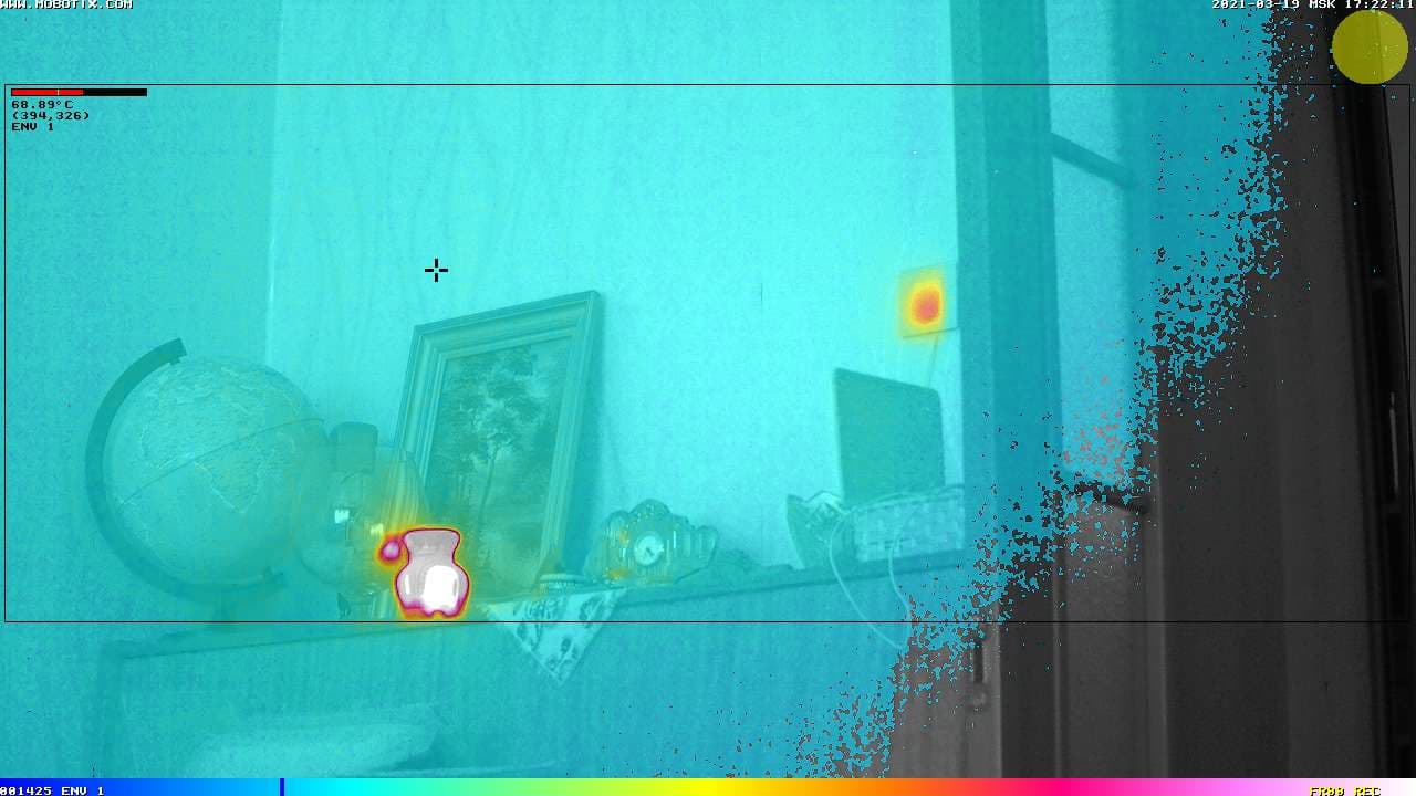 Один из режимов, доступный для использования — режим теплового наложения. Он позволяет в одном окне контролировать сразу два потока. Но есть сложность, заключающаяся в разных углах обзора модулей: 30°×17° у оптического и 30°×26° у термографического. То есть оптический модуль дает картинку с соотношением сторон 16:9, в то время как тепловизионный модуль «снимает» с аспектом 4:3. Такая разница затрудняет наложение картинок друг на друга, и добиться точного соответствия оказывается непросто. Плюс ко всему нужно учитывать чуть разное фокусное расстояние объективов сенсоров, а также эффект параллакса, ведь оси камер расположены параллельно, как в стереокамерах. Неточность наложения частично компенсируется с помощью инструментов, которые прячутся в блоке Setup Menu → Настройки теплового видеосенсора, а подстройку картинок удобнее проводить при наличии в кадре двух или более источников тепла, которые легко идентифицировать в обычном, оптическом потоке. Как в следующем скриншоте, где в кадре оказался «умный» настенный выключатель (оказывается, он неплохо нагревается!) и ароматическая лампа с горящей внутри свечкой.