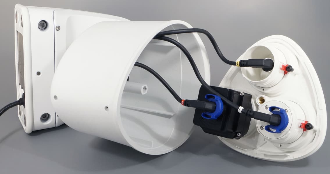 Предоставленный на тестирование экземпляр включает в себя два модуля: оптический видимого спектра (на фотографии он белого цвета с кабелем под цифрой 1) и термографический (черного цвета с кабелем №3). Разъем, которым модули связываются с электроникой камеры, напоминает USB Type-C. Но, конечно, к стандарту USB он не имеет отношения, этот коннектор здесь используется по причине удачной конструкции и нужного количества контактов.